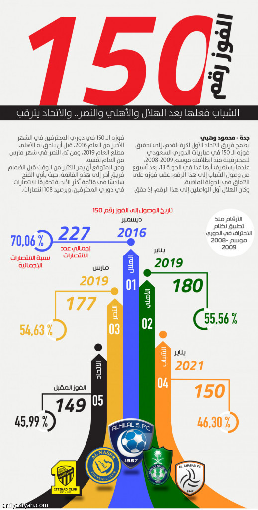 وكان الهلال أول الواصلين إلى هذا الرقم، إذ حقق فوزه الـ 150 في دوري المحترفين في الشهر الأخير من العام 2016، قبل أن يلحق به الأهلي مطلع العام 2019، ومن ثم النصر في شهر مارس من العام نفسه.