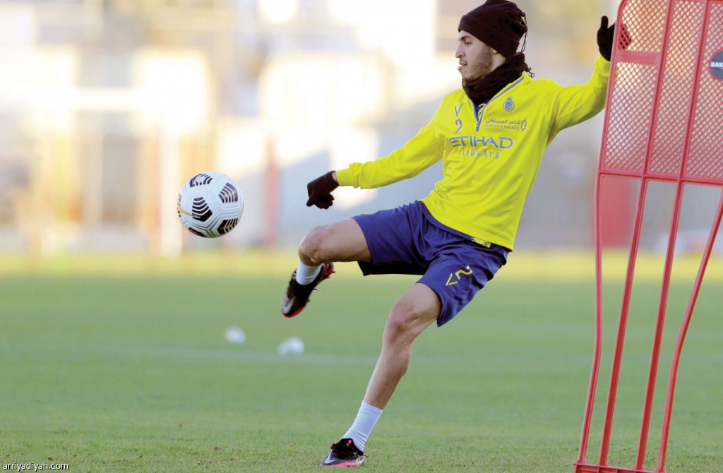صورة التقطت أمس لسلطان الغنام لاعب فريق النصر الأول لكرة القدم يسدد الكرة خلال تدريبات الفريق استعدادًا للقاء الرائد غدًا(المركز الإعلامي ـ النصر)