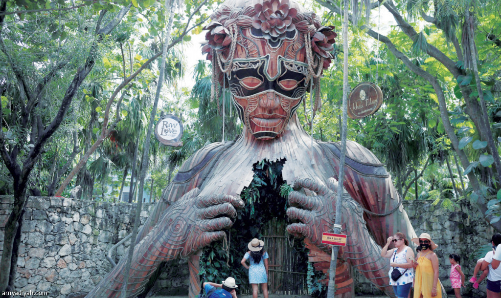 يجذب مجسَّم خشبي صمَّمه دانيال بوبر الفنان الجنوب إفريقي السياح في منتجع آهاو تولوم في ولاية كوينتانا رو في المكسيك على الرغم من القلق الكبير من انتشار فيروس كورونا.. وفي الصورة سياح يأخذون صورًا تذكارية عند المجسَّم العملاق