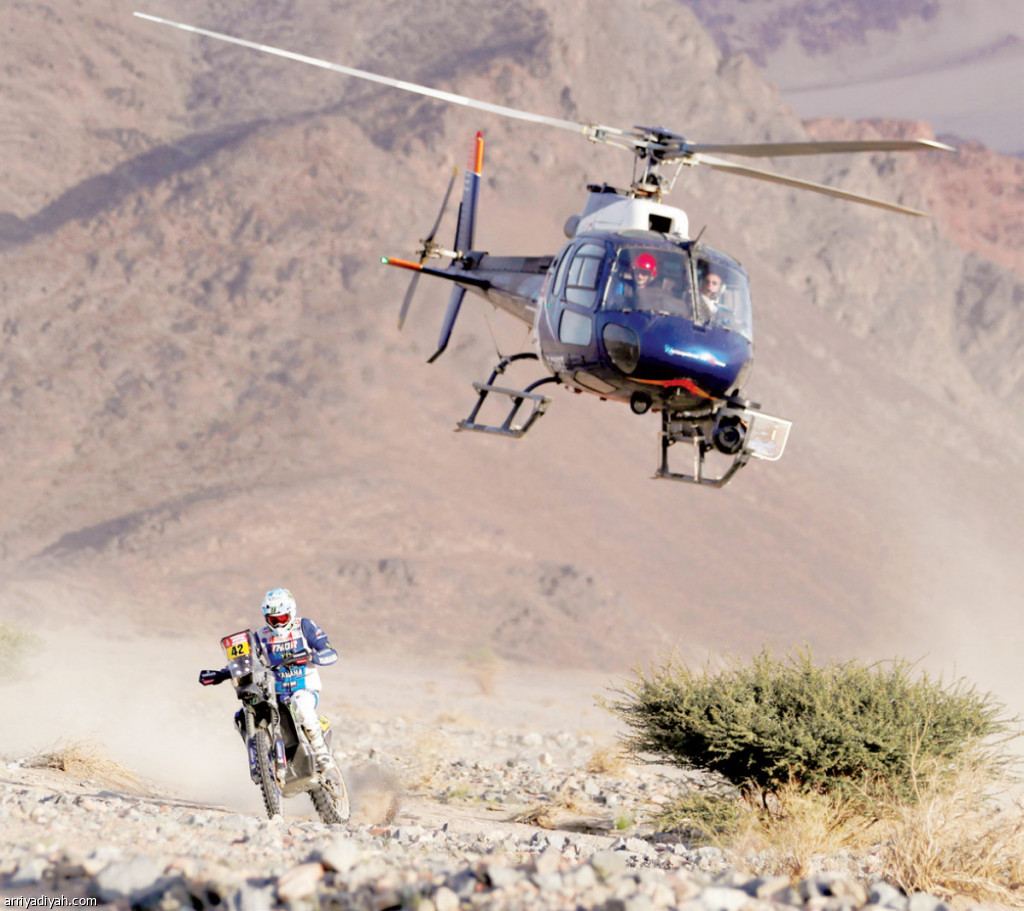 صورة التقطت لمروحية تابعة لمنظمي السباق تتابع الفرنسي أدريان فان بيفرين دراج مونستير اينيرجي ياماها خلال أحد مسارات المرحلة الـ 11 (رويترز)