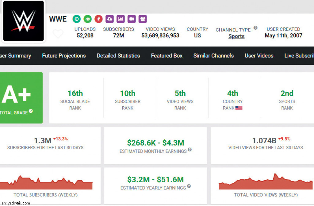 حافظت قناة المصارعة الحرة الترفيهية wwe على موقعها الأول في قائمة القنوات الرياضية الأكثر متابعة ومشاهدة على “يوتيوب”، بعد أن سجلت حتى أمس 72 مليون مشترك، و53.686 مليار مشاهدة، منذ إطلاقها في 11 مايو 2007. وعلى الرغم من خسارتها في الثلاثين يومًا الماضية 1.3 مليون مشترك “13.%”، و1.7 مليار مشاهدة “9.5%”، إلا أن القناة ظلت تتفوق بفارق كبير على أقرب مثيلاتها وهي “دود بيرفكت” للألعاب الترفيهية التي تملك 54 مليون مشترك، و12.268 مليار مشاهدة.