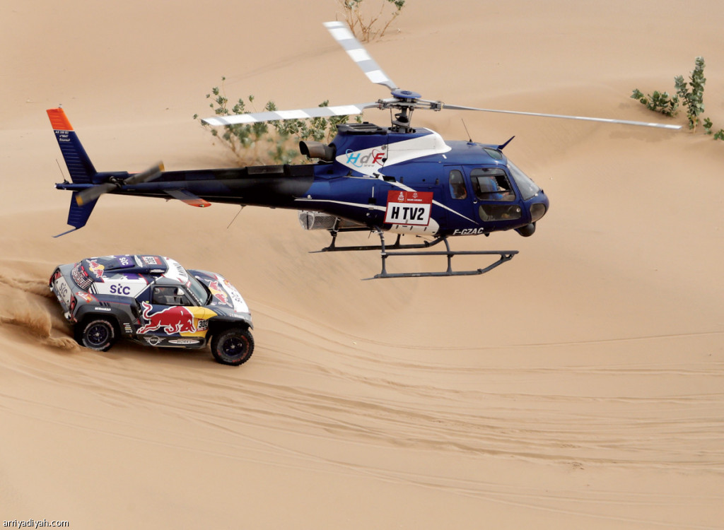 صورة التقطت لطائرة مروحية تحلق فوق احدى السيارات المشاركة في رالي داكار السعودية 2021 خلال المراحل الأخيرة