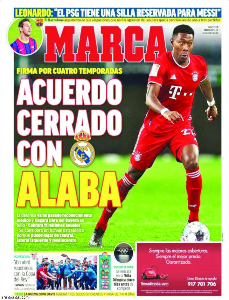 كذّب جورج ألابا والد ووكيل أعمال النمساوي دافيد ألابا، مدافع فريق بايرن ميونيخ الألماني الأول لكرة القدم، ما نشرته صحيفة “ماركا” الإسبانية عن التوصل لاتفاق لانتقال اللاعب إلى ريال مدريد الصيف المقبل بعد نهاية عقده. وأكد ألابا لقناة “سبورت1” الألمانية، أنه “لم يُتخذ أي قرار حتى الآن وأن ابنه لم يوقع بعد مع ريال مدريد”، موضحًا أن ما يهمه الآن أن يكون ابنه مركزًا تمامًا على أدائه مع فريقه. وكانت “ماركا” المقربة من نادي ريال مدريد أكدت أمس توصل اللاعب، إلى اتفاق مبدئي مع الريال للانتقال إلى صفوفه بعقد لأربعة أعوام مقابل راتب سنوي قدره 11 مليون يورو. وحتى إن الصحيفة ادعت أن اللاعب “28 عامًا” أجرى الفحص الطبي الروتيني بوجود طبيب من النادي.