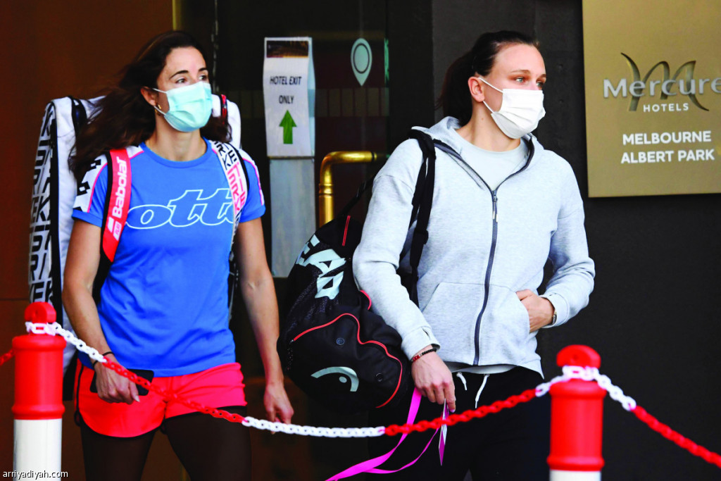 صورة التقطت أمس للفرنسية أليز كورنيه وساندرا المدربة أثناء مغادرة الفندق لأداء التدريب في الحجر الصحي قبل بطولة أستراليا المفتوحة للتنس (الفرنسية)