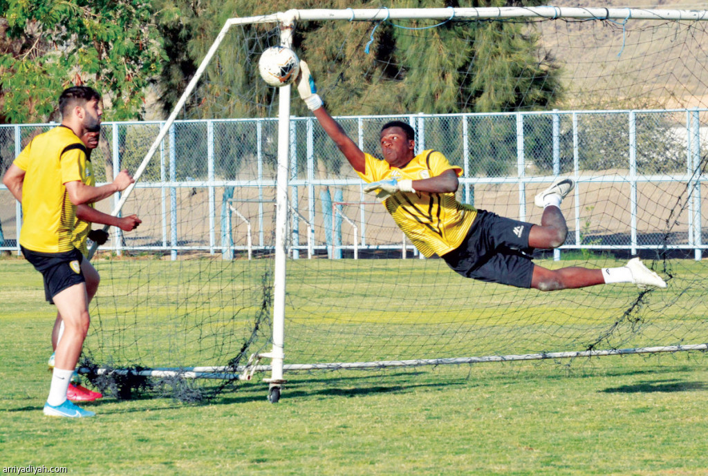 صورة التقطت أمس لبندر مسفر حارس فريق نجران الأول لكرة القدم يتصدى لإحدى الكرات أثناء التدريبات (المركز الإعلامي ـ نجران)