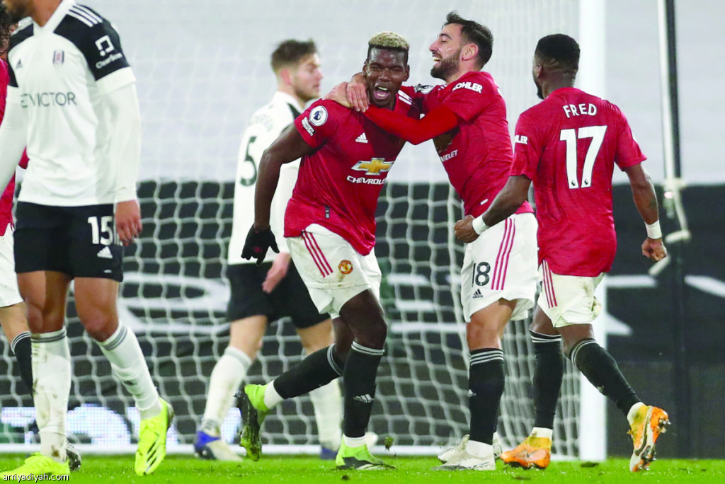 صورة التقطت الأربعاء الماضي لبوجبا يحتفل مع البرتغالي برونو هيرنانديز والبرازيلي فريد زميليه بهدف الفوز الذي سجله في مرمى فولهام “2ـ1” (الفرنسية)