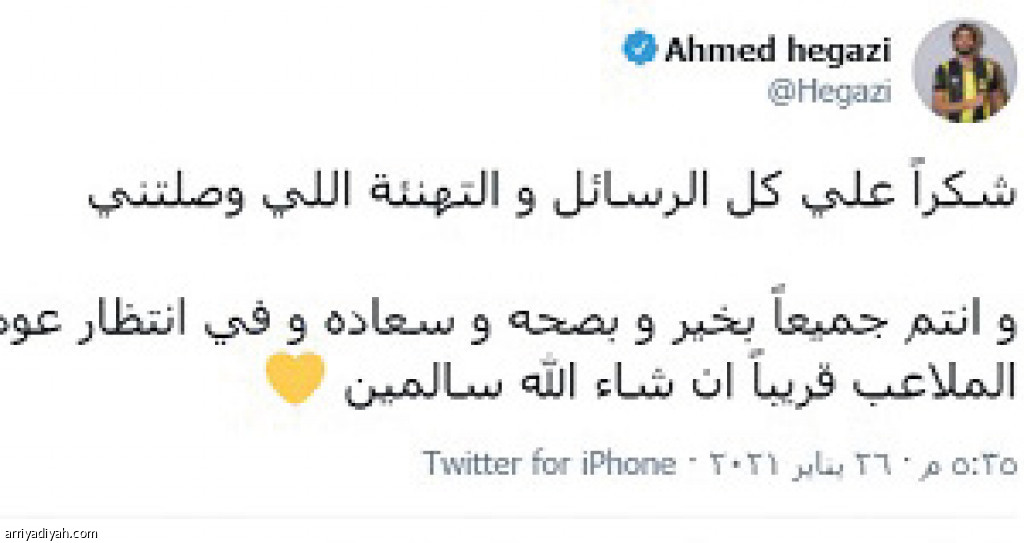 قدّم المصري أحمد حجازي، مدافع فريق الاتحاد الأول لكرة القدم، الشكر للجماهير على رسائل التهنئة التي وصلته بمناسبة يوم ميلاده، حيث نشر تغريدة عبر حسابه على تويتر، قال فيها: “شكرًا على كل الرسائل والتهنئة التي وصلتني، وفي انتظار عودتكم إلى الملاعب قريبًا”.