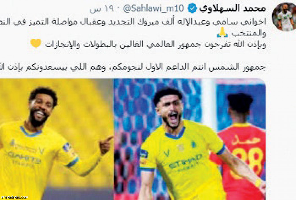 احتفت جماهير النصر بتغريدة محمد السهلاوي مهاجم فريق التعاون الأول لكرة القدم، وفريقهم السابق والتي نشرها عبر حسابه على موقع التواصل الاجتماعي “تويتر” وبارك فيها لسامي النجعي وعبدالإله العمري بعد تجديد عقديهما، وطالبهما بإسعاد الجمهور بالبطولات.