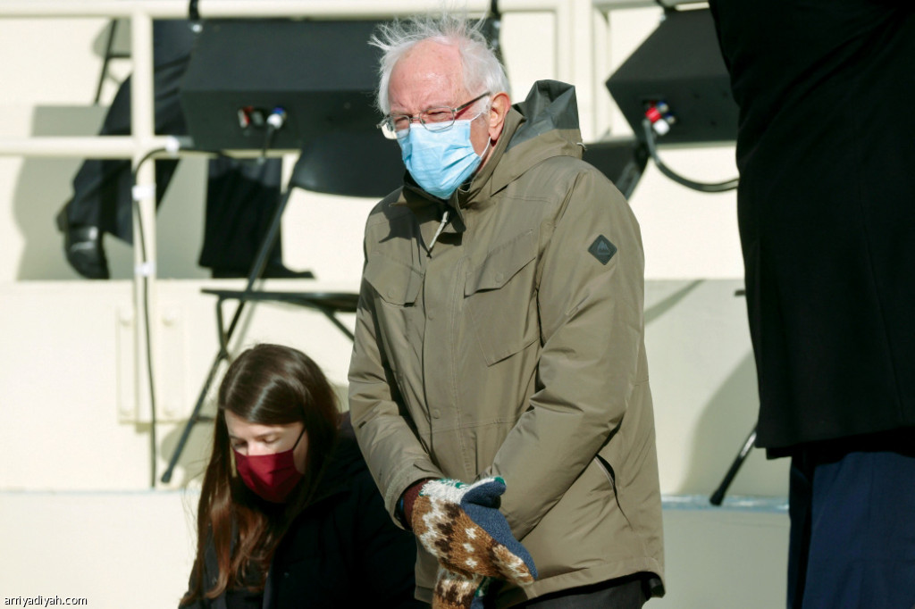 صورة التقطت في 20 يناير الماضي لبيرني ساندرز السيناتور الأمريكي يظهر مرتديًا قفارين أثناء حضوره مراسم تنصيب جو بايدن الرئيس الأمريكي (رويترز)