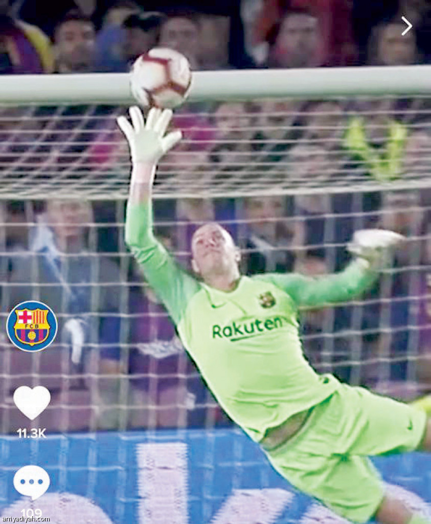 أظهر الألماني مارك أندريه- تير شتيجن حارس مرمى فريق برشلونة الإسباني الأول لكرة القدم براعته في الطيران في مقطع فيديو نشره حساب النادي أمس على تيك توك وهو يتصدى لرأسية مفاجئة على مرماه.