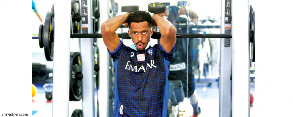 صورة التقطت أمس لمحمد كنو لاعب فريق الهلال الأول لكرة القدم يجري تدريباته في صالة الحديد وتبدو آثار الإصابة واضحة على ركبته (المركز الإعلامي ـ الهلال)