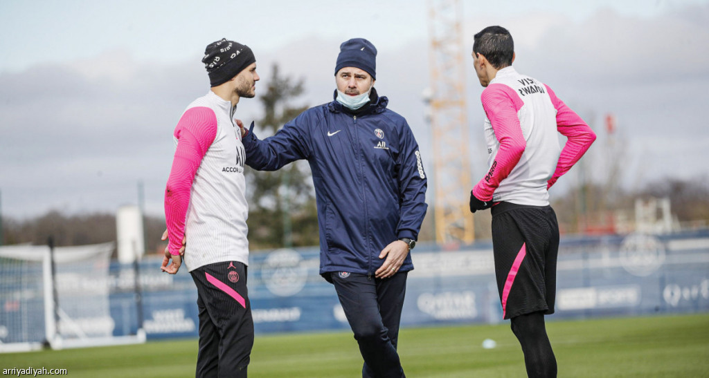 صورة التقطت أمس للأرجنتيني ماوريسيو بوكوتينيو مدرب باريس سان جيرمان يتحدث إلى آنخيل دي ماريا وإيكاردي مواطنيه قبل الحصة التدريبية للفريق (المركز الإعلامي ـ باريس سان جيرمان)