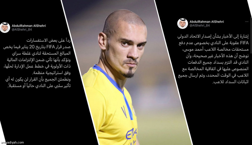وكان الشهري قد دون تغريدة عبر حسابه الشخصي في تويتر منصة التواصل الاجتماعي، الإثنين، نفى فيها صدور أي عقوبة تخص مستحقات النيجيري أحمد موسى لاعب فريق السابق، ولم يتطرق لغيره، كتب فيها: "إشارة إلى الأخبار بشأن إصدار الاتحاد الدولي FIFA عقوبة على النادي بخصوص عدم دفع مستحقات مخالصة اللاعب أحمد موسى، نوضح أن هذه الأخبار غير صحيحة، وأن النادي قد التزم بسداد جميع الدفعات المنصوص عليها في اتفاقية المخالصة مع اللاعب في الوقت المحدد، وتم ارسال جميع إثباتات السداد للاعب."