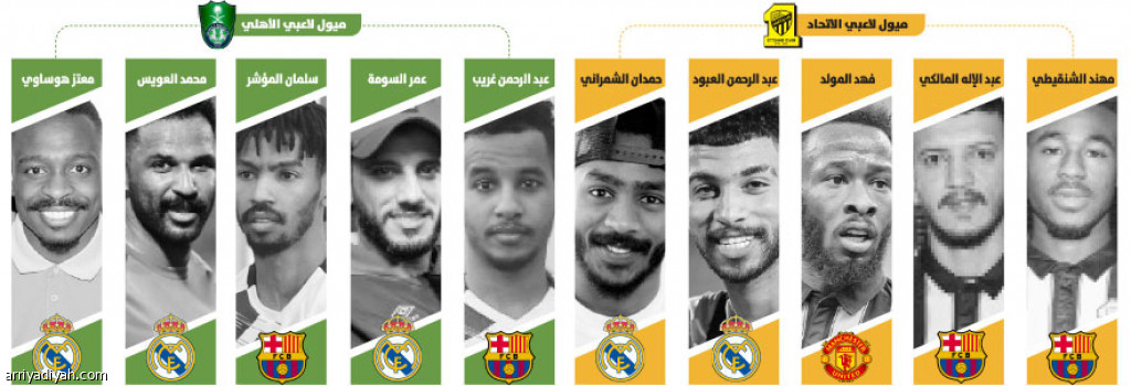 قبل انطلاق صافرة “ديربي الغربية” الذي يجمع الاتحاد والأهلي، اليوم، في المباراة المدرجة ضمن منافسات دوري كأس محمد بن سلمان للمحترفين، أجرينا إحصاءً من معسكر الجارين اللدودين عن ميول بعض اللاعبين للأندية الأوروبية، وبحسب الإحصاء فإن الغالبية من لاعبي الفريقين توزع عشقهم بين قطبي كلاسيكو العالم ريال مدريد وبرشلونة.