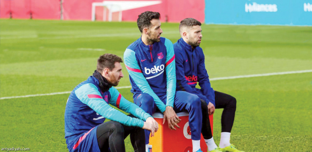 صورة التقطت أمس لميسي وبوسكيتس وألبا لاعبي برشلونة قبل انطلاق التدريبات استعدادًا لمواجهة ألافيس في الدوري الإسباني لكرة القدم (المركز الإعلامي ـ برشلونة)