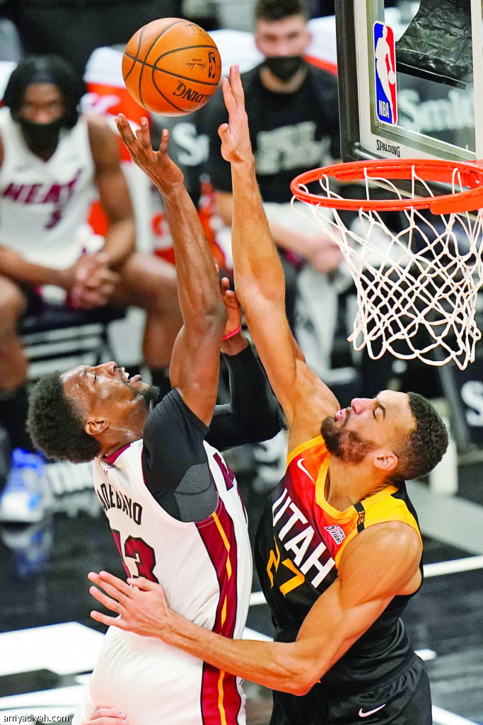 صورة التقطت لرودي جوبيرت لاعب ميامي هيت يحجب أديبايو لاعب يوتا جاز من التسجيل