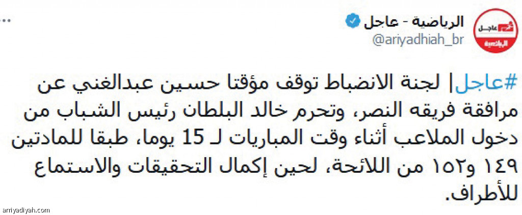 حظيت تغريدتا حساب “الرياضية عاجل”، عبر موقع التواصل الاجتماعي “تويتر”، اللتان انفرد بهما حول مستجدات قضية خالد البلطان، رئيس نادي الشباب، وحسين عبد الغني، المدير التنفيذي لنادي النصر، بتفاعل كبير في الطائر الأزرق تجاوز 2.7 مليون. وحققت تغريدة إيقاف البلطان وعبد الغني من قبل لجنة الانضباط في الاتحاد السعودي لكرة القدم 2.6 مليون ظهور، بينما تجاوزت الردود عليها 800. فيما تفاعل 1.1 مليون مع تغريدة تقديم عبد الغني شكوى للنيابة العامة ضد البلطان والبرازيلي سيبا، لاعب الليث، بدعوى التشهير والإساءة، حيث علَّق عليها 1.1 ألف.