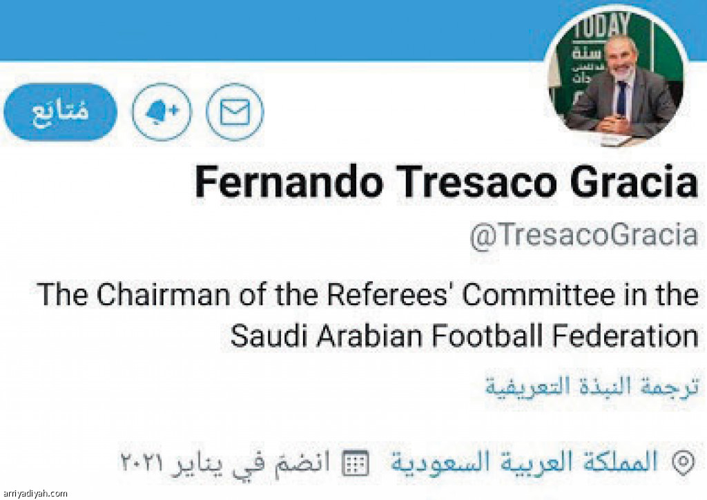 حذف الإسباني فرناندو تريساكو، رئيس لجنة الحكام في الاتحاد السعودي لكرة القدم، حسابه الشخصي في موقع التواصل الاجتماعي تويتر بعد 47 يومًا من تدشينه بغرض شرح الحالات التحكيمية، التي تشهد جدلًا في مباريات دوري كأس محمد بن سلمان للمحترفين.