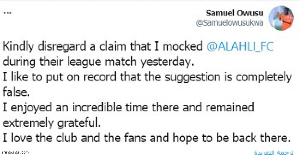 نفى الغاني صمويل أوسو، لاعب فريق الفيحاء ، سخريته من نتيجة الأهلي فريقه السابق أمام العين، وذلك بعد الفيديو الذي نشره أثناء متابعته المباراة، وكان يقرب النتيجة بالكاميرا حيث كان الفريق وقتها متأخرًا بهدف. وقال أوسو في تغريدة عبر حسابه على “تويتر”: “يرجى تجاهل الادعاء الذي يقول إنني سخرت من النتيجة. لقد استمتعت بوقت رائع مع الأهلي، أحب النادي والجماهير، وأتمنى أن أعود مرة أخرى”.