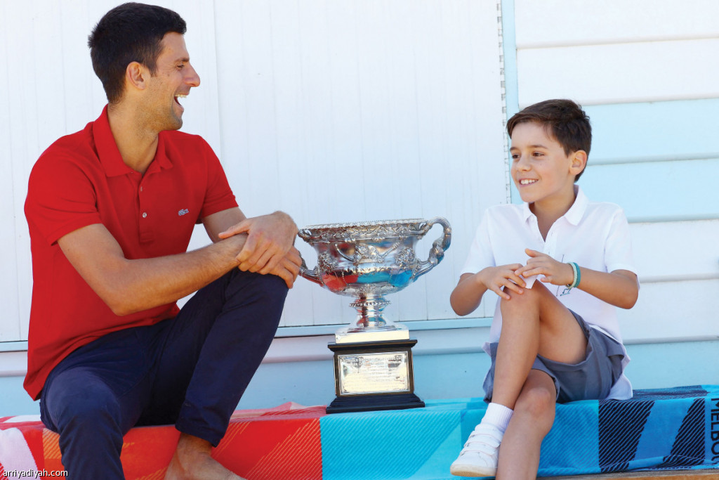 احتفل الصربي نوفاك ديوكوفيتش لاعب التنس، بلقبه التاسع في بطولة أستراليا في شاطئ برايتون في ملبورن الأسترالية.. صورة التقطت أمس، ديوكوفيتش يجلس بجوار الطفل أندريا أحد حضور الحفل وتتوسطهم كأس التحدي نورمان بروكس