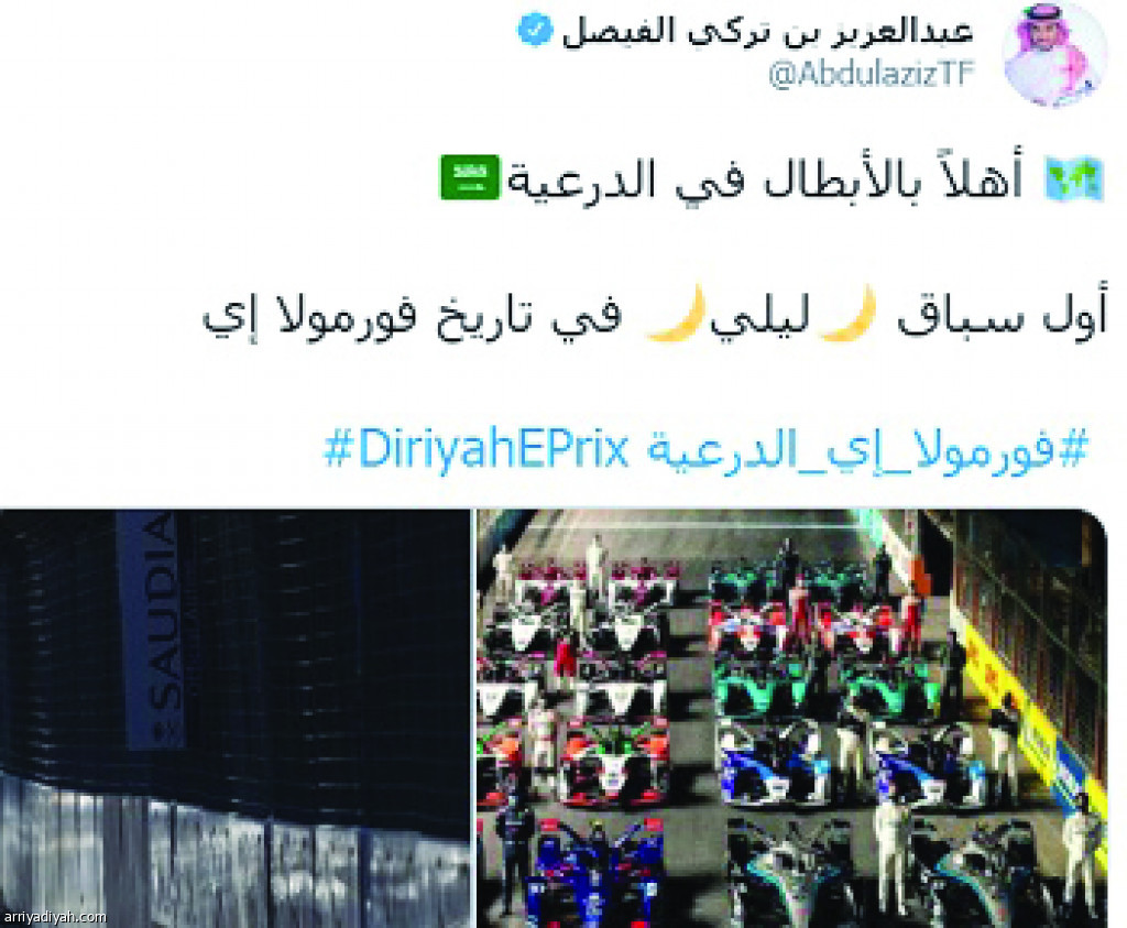 رحَّب الأمير عبد العزيز الفيصل، وزير الرياضة، بالمشاركين في سباق “فورمولا إي” من خلال تغريدة، أطلقها عبر حسابه في موقع التواصل الاجتماعي تويتر، قال فيها: “أهلًا بالأبطال في الدرعية، أول سباق ليلي في تاريخ فورمولا إي”.