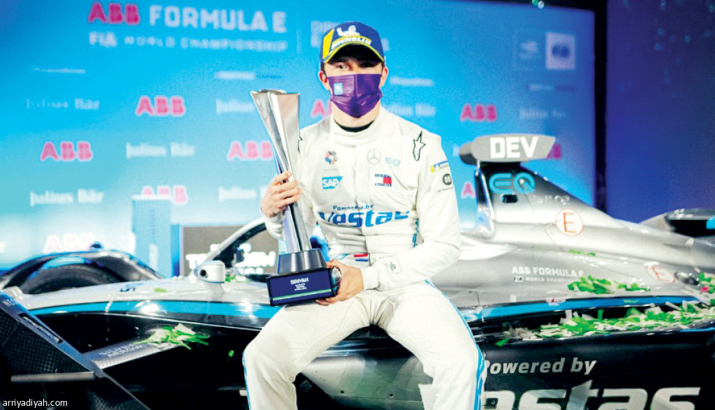 صورة التقطت أمس للهولندي نيك دي فريز سائق فريق مرسيدس بنز أي كيو بعد تتويجه بلقب الجولة الأولى من سباق فورمولا إي الدرعية 2021 (المركز الإعلامي ـ فريق مرسيدس بنز أي كيو)
