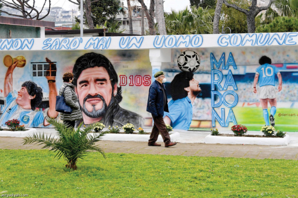 ترتبط مدينة نابولي الإيطالية بعلاقة خاصة مع مارادونا الأسطورة الراحل، ويشهد بذلك منظر عام لجدارية رسمت بواسطة داريو سانتوسي على جدار غرفة الملابس في ملعب ماريومورتو لكرة القدم في باكولي بالقرب من مدينة نابولي الإيطالية للاعب الفذ..