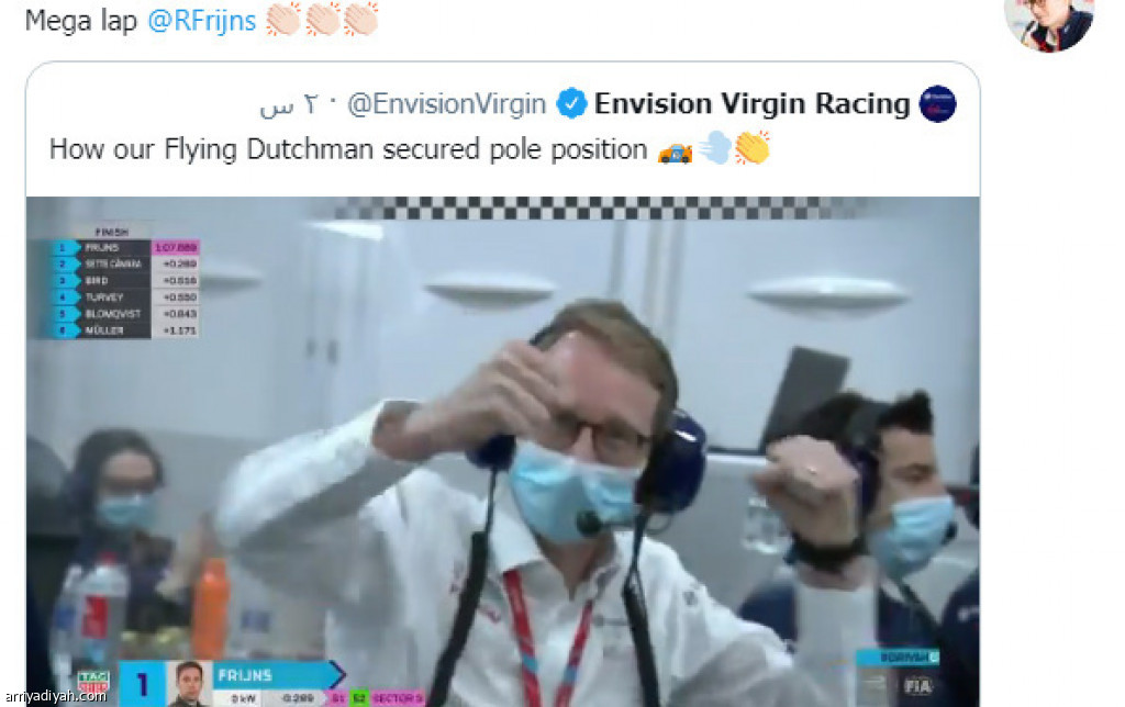 نشر حساب فريق “إنفيشن فيرجين راسينج” أمس على تويتر، فرحة الطاقم الفني بعد أن حصل الهولندي روبن فيرجنز، سائق الفريق، على مركز الانطلاق الأول في سباق فورومولا إي الدرعية للسيارات الكهربائية.