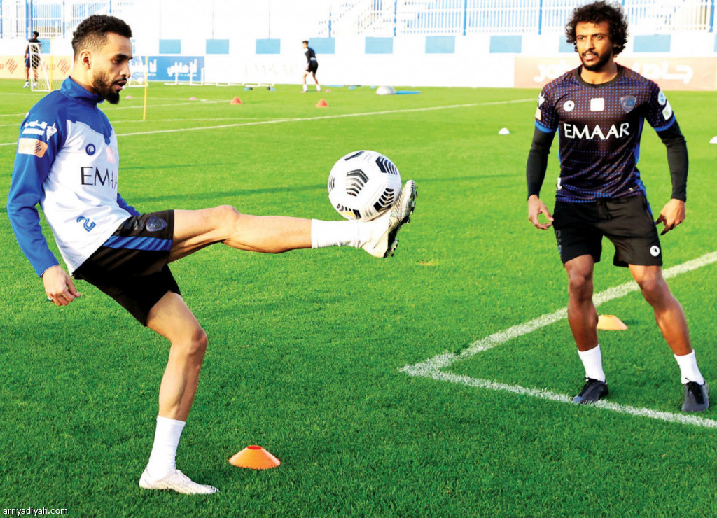صورة التقطت أمس لمحمد البريك ظهير أيمن الهلال يروِّض الكرة تحت أنظار زميله ياسر الشهراني الظهير الأيسر في آخر الحصص التدريبية قبل ملاقاة الفتح اليوم (المركز الإعلامي ـ الهلال)