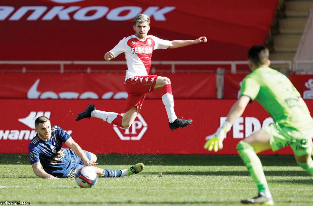 صورة التقطت أمس لكيفن فولاند لاعب موناكو يقفز عاليًا فوق أحد المدافعين بعد تسديده الكرة نحو الشباك (الفرنسية)