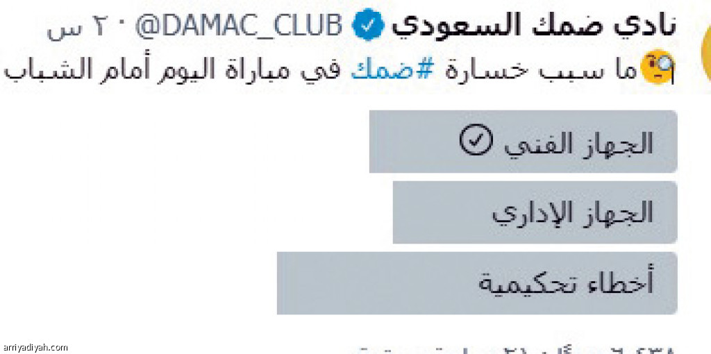 نشر حساب نادي ضمك على موقع التواصل الاجتماعي “تويتر”، استطلاعًا للجماهير حول سبب خسارة الفريق الأول لكرة القدم أمام الشباب، أمس، ضمن الجولة الـ 21 من دوري كأس محمد بن سلمان للمحترفين.