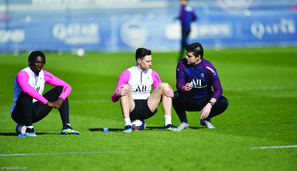 صورة التقطت أمس الأول للأرجنتيني ماوريسيو بوكيتينو مدرب باريس سان جيرمان يتحدث إلى الألماني يوليان دراكسلر لاعب الوسط (المركز الإعلامي ـ باريس سان جيرمان)