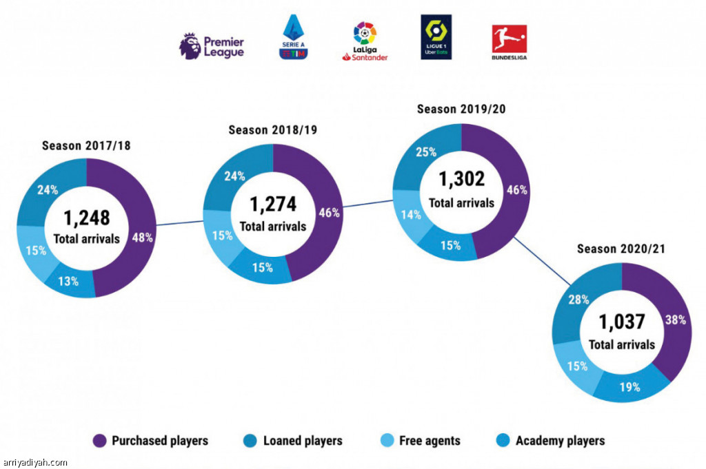 انخفضت الصفقات التعاقدات الصيفية والشتوية في الموسم الجاري “2020 ـ 2021”، في الخمسة دوريات الكبرى لكرة القدم ، الإنجليزي، الإسباني، الفرنسي، الإيطالي، الألماني بشكل كبير، مقارنة بالعام السابق، بنحو 20 في المئة، من 1302 حتى 1037 صفقة في العام الجاري.