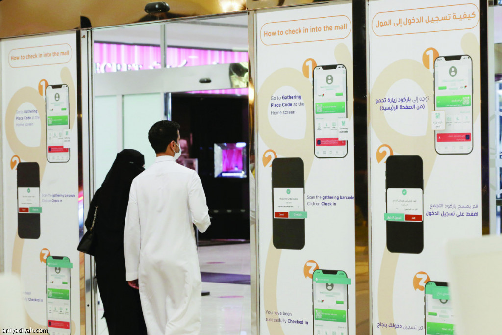 صورة التقطت الأربعاء الماضي لرجل وامرأة يدخلان إلى غرناطة مول في الرياض بعد إظهار حالتيهما الصحيتين عبر تطبيق “توكلنا” الإلكتروني(رويترز)