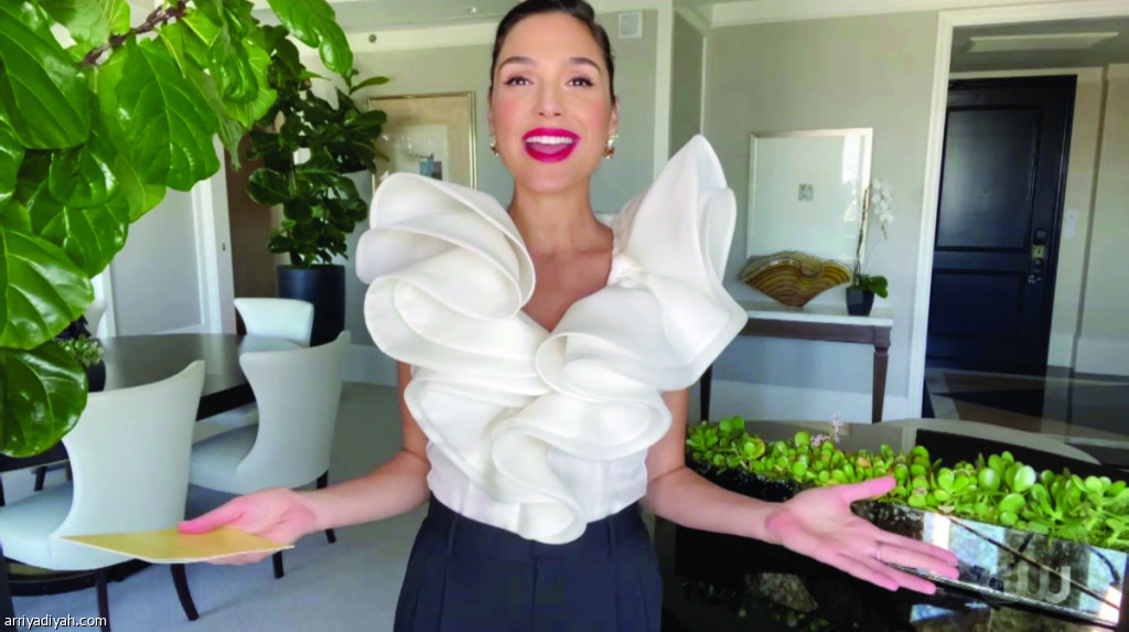 صورة التقطت أمس بتوقيت السعودية لجال جادوت، مقدّمة حفل جوائز اختيار النقاد الأمريكية أثناء انعقاد الحدث الفني (رويترز)