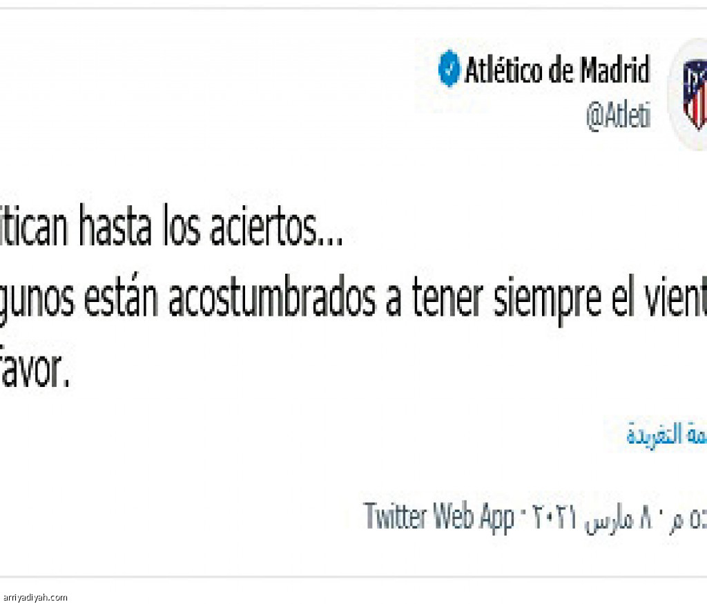 حظيت تغريدة حساب فريق أتلتيكو مدريد الأول لكرة القدم، في موقع التواصل الاجتماعي تويتر، التي هاجم فيها ضمنيًّا ريال مدريد، غريمه التقليدي، بسبب انتقاد بعض مسؤوليه التحكيم في مباراة الديربي، بتفاعل كبير. وقال حساب أتلتيكو في التغريدة: “إنهم ينتقدون حتى النجاحات. اعتاد بعضهم، على أن تكون الريح لصالحهم دائمًا”. حيث بلغت الردود عليها 4.8 ألف بعد السجال الكبير بين مشجعي الفريقين.
