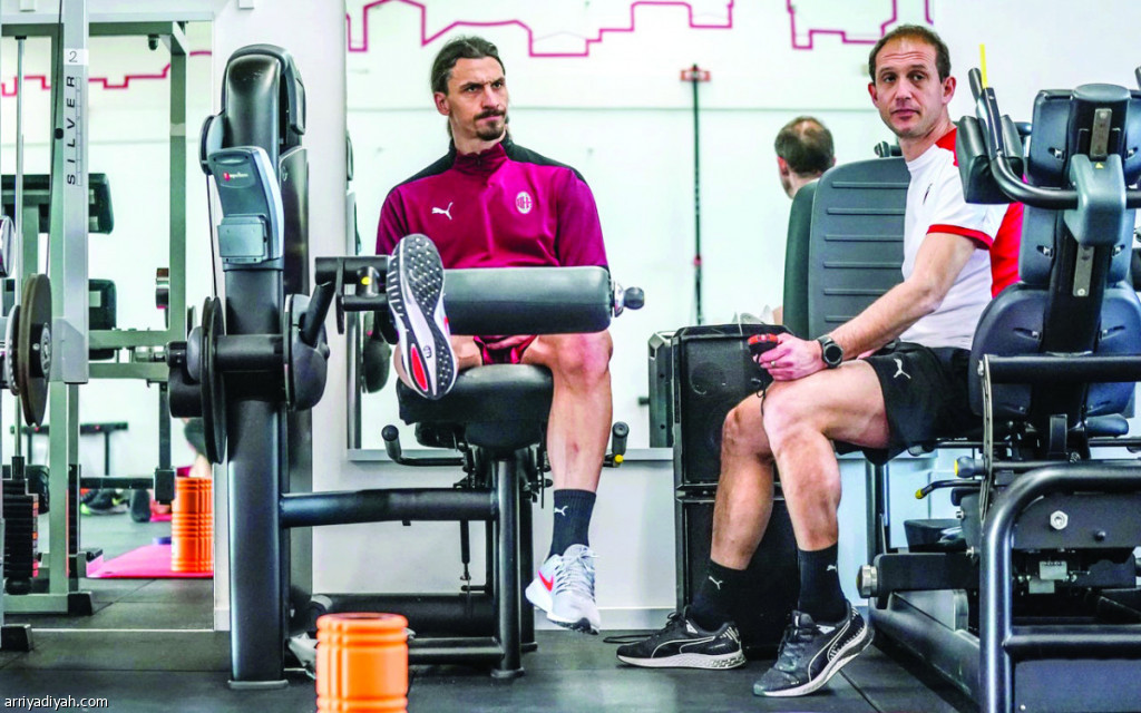 يستعد فريق ميلان الإيطالي الأول لكرة القدم لمواجهة نظيره مانشستر يونايتد الإنجليزي في دور الـ 16 من الدوري الأوروبي الخميس المقبل.. صورة التقطت أمس، إبراهيموفيتش مهاجم الفريق مع أحد أعضاء الجهاز الفني أثناء التدريبات التأهيلية