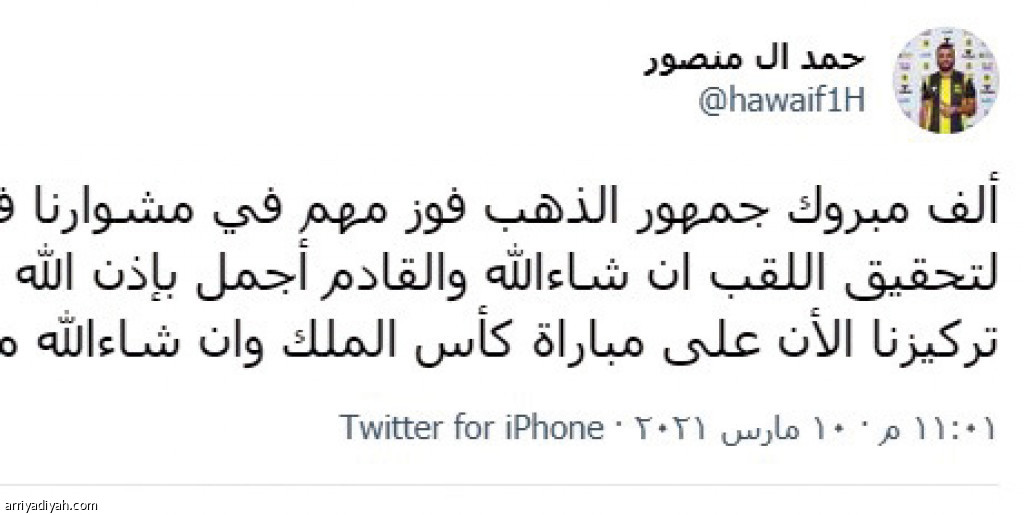 يعد حمد آل منصور، لاعب فريق الاتحاد الأول لكرة القدم، أول المحتفين من بين زملائه بالانتصار على الشباب في مباراة الكلاسيكو أمس، حيث كشف عن رغبتهم الكبيرة للمنافسة على اللقب. ونشر آل منصور تغريدة، في حسابه على “تويتر”، قال فيها: “ألف مبروك جمهور الذهب، فوز مهم في مشوارنا في الدوري لتحقيق اللقب إن شاء الله.. تركيزنا الآن على مباراة كأس الملك وإن شاء الله من نصيبنا”.