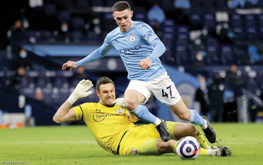 صورة التقطت أمس الأول لفوديل لاعب مانشستر سيتي لحظة تعرضه للعرقلة من مكارثي حارس مرمى ساوثهامبتون أثناء المباراة (الفرنسية)