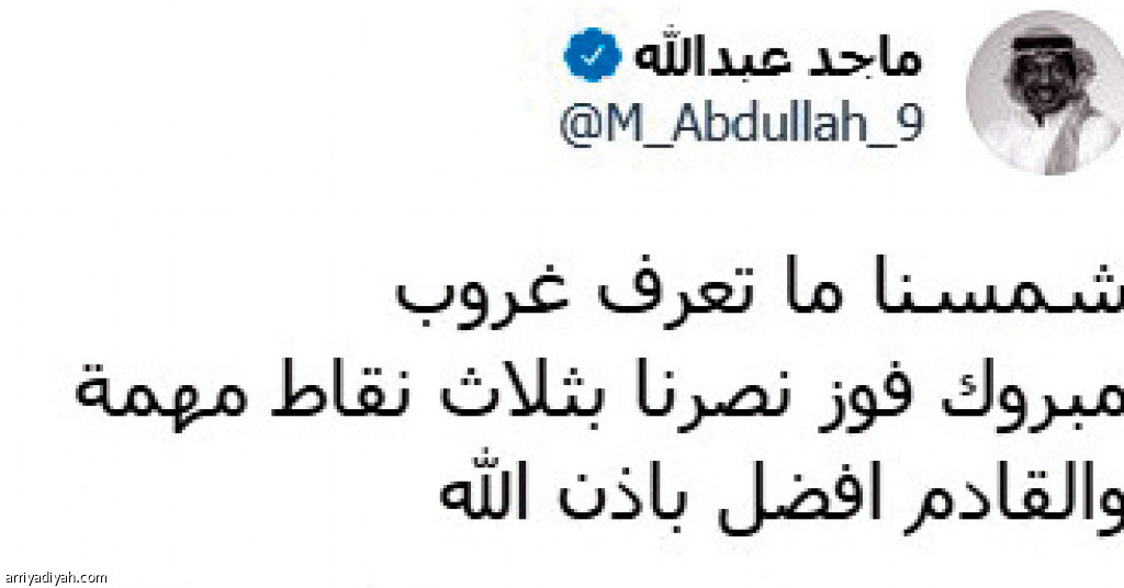 بارك ماجد عبد الله، أسطورة الكرة السعودية، لجماهير النصر الانتصار على الأهلي، وذلك من خلال تغريدة عبر حسابه على “تويتر” قال فيها: “شمسنا ما تعرف غروب.. مبروك فوز نصرنا بثلاث نقاط مهمة”.