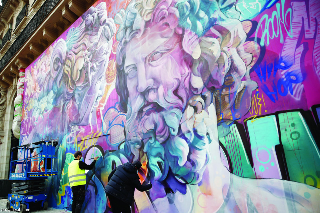 يعمل بيتشي وإيفو فنانا رسم الشوارع الإسبانيان على إنجاز العديد من اللوحات في الميادين العامة، على الرغم من تفشي فيروس كورونا في العالم.. وفي الصورة الفنانان خلال عملهما على لوحة في باريس العاصمة الفرنسية (رويترز)