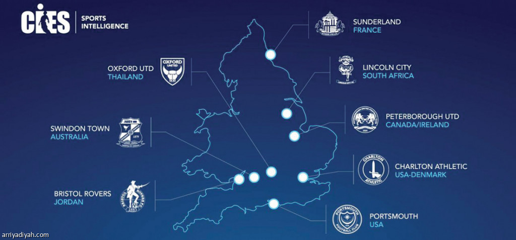 وجاءت جنسيات الملاك الأجانب الثمانية من فرنسا وجنوب إفريقيا وكندا وأمريكا وتايلاند وأستراليا، وأيضًا مالك عربي وحيد لنادي بريستول روفيرس من الأردن.