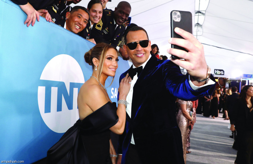 صورة التقطت في 19 يناير 2020، لأليكس رودريجيز يلتقط صورة بهاتفه مع جنيفر لوبيز عند وصولهما إلى حفل توزيع جوائز نقابة الممثلي (أسوشيتد برس)