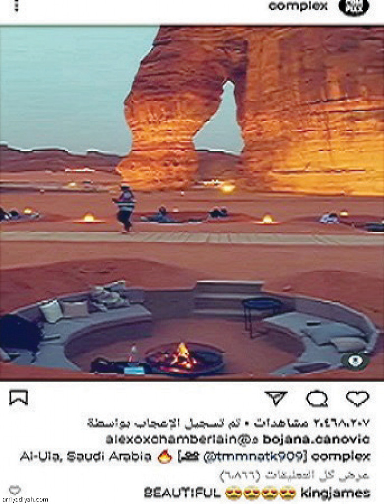 وكان الفيديو، الذي نشره حساب “كومبلكس” المختصة بالترفيه، أظهر السياح والزوار يستمتعون بالجلسات الخارجية في الهواء الطلق مقابل جبل الفيل وأمام كل جلسة “شبة نار”، حيث علَّق عليه ليبرون قائلاً “جميل” مع وضع أيقونتي قلب وعيون.