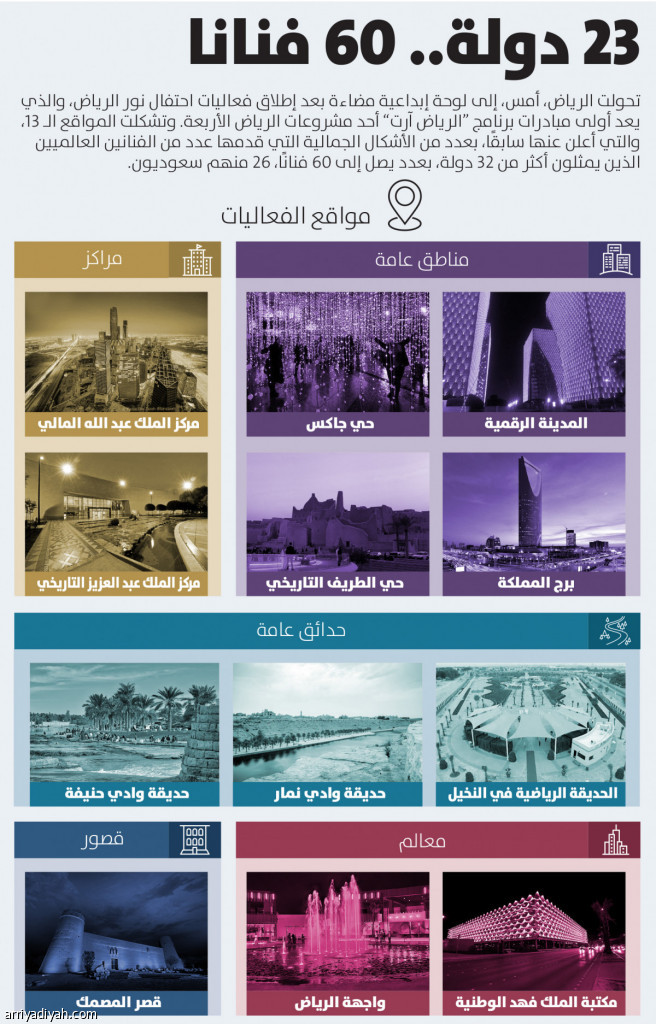 تحولت الرياض، أمس، إلى لوحة إبداعية مضاءة بعد إطلاق فعاليات احتفال نور الرياض، والذي يعد أولى مبادرات برنامج “الرياض آرت” أحد مشروعات الرياض الأربعة. وتشكلت المواقع الـ 13، والتي أعلن عنها سابقًا، بعدد من الأشكال الجمالية التي قدمها عدد من الفنانين العالميين الذين يمثلون أكثر من 32 دولة، بعدد يصل إلى 60 فنانًا، 26 منهم سعوديون.