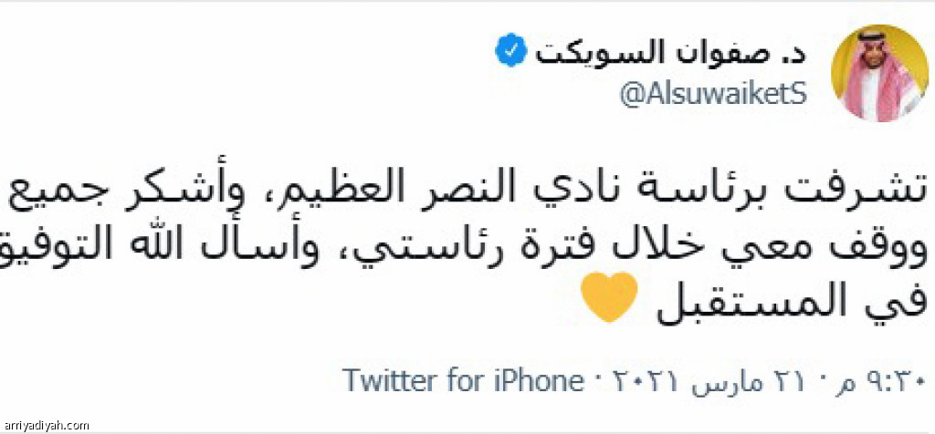تفاعل صفوان السويكت مع قرار وزارة الرياضة بإعفائه من رئاسة النصر، من خلال حسابه على “تويتر”، حيث حذف “رئيس النصر” من البايو، ووضع الآية الكريمة “والله يعلم وأنتم لا تعلمون”. فيما كانت تغريدته الأولى بعد 5 ساعات من صدور القرار، وأكد فيها تشرفه برئاسة الأصفر، وشكر من دعمه ووقف معه خلال فترته، دون التطرق إلى المخالفات التي كانت سببًا في إعفائه. وكان حساب السويكت شهد تراجعًا في عدد المتابعين، بعدما تخلى 600 شخص عن متابعته بعد الإعفاء.