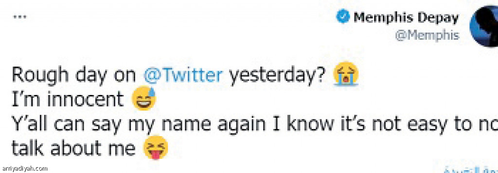 دخل الهولندي ممفيس ديباي لاعب فريق ليون الفرنسي الأول لكرة القدم، في حرج مع معجبيه، بعدما أوقفت منصة “تويتر” أي حساب يكتب الاسم الأول له باللغة الإنجليزية، قبل أن تعتذر وتعزو الأمر لثغرة أمنية. وعلَّق اللاعب الدولي على الواقعة بعدما حلّت الشركة المشكلة قائلًا: “أنا بريء، يمكنكم كتابة اسمي مرة أخرى، أعلم أنه ليس من السهل عدم التحدث عني”.