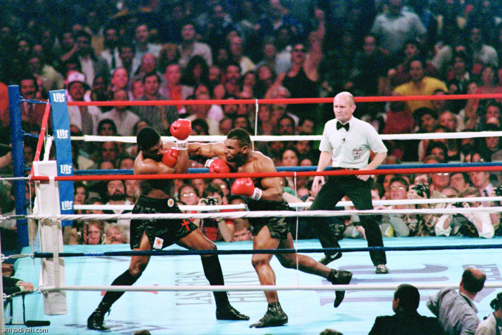 صورة التقطت في 22 نوفمبر 1986 في لاس فيجاس وبُثَّت أمس لتايسون يوجِّه ضربةً لتريفور بيربيك منافسه ليصبح أصغر بطل للعالم للوزن الثقيل(الفرنسية)