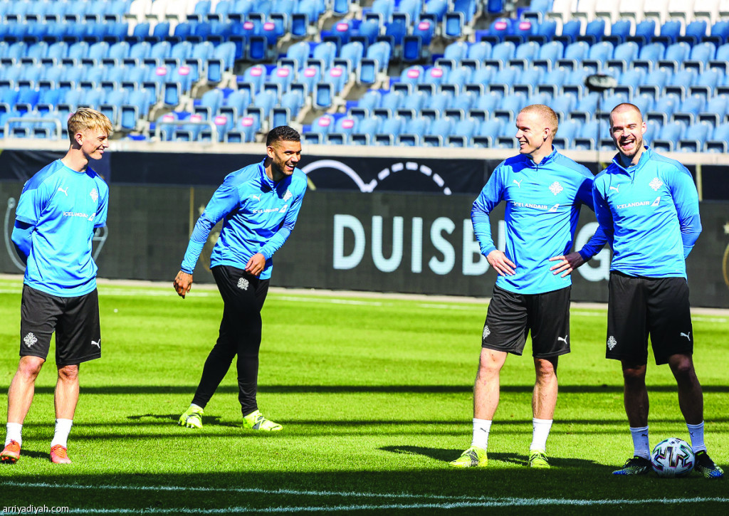 صورة التقطت أمس للاعبي منتخب آيسلندا في التدريبات الأخيرة استعدادًا لمواجهة ألمانيا اليوم (المركز الإعلامي ـ آيسلندا)