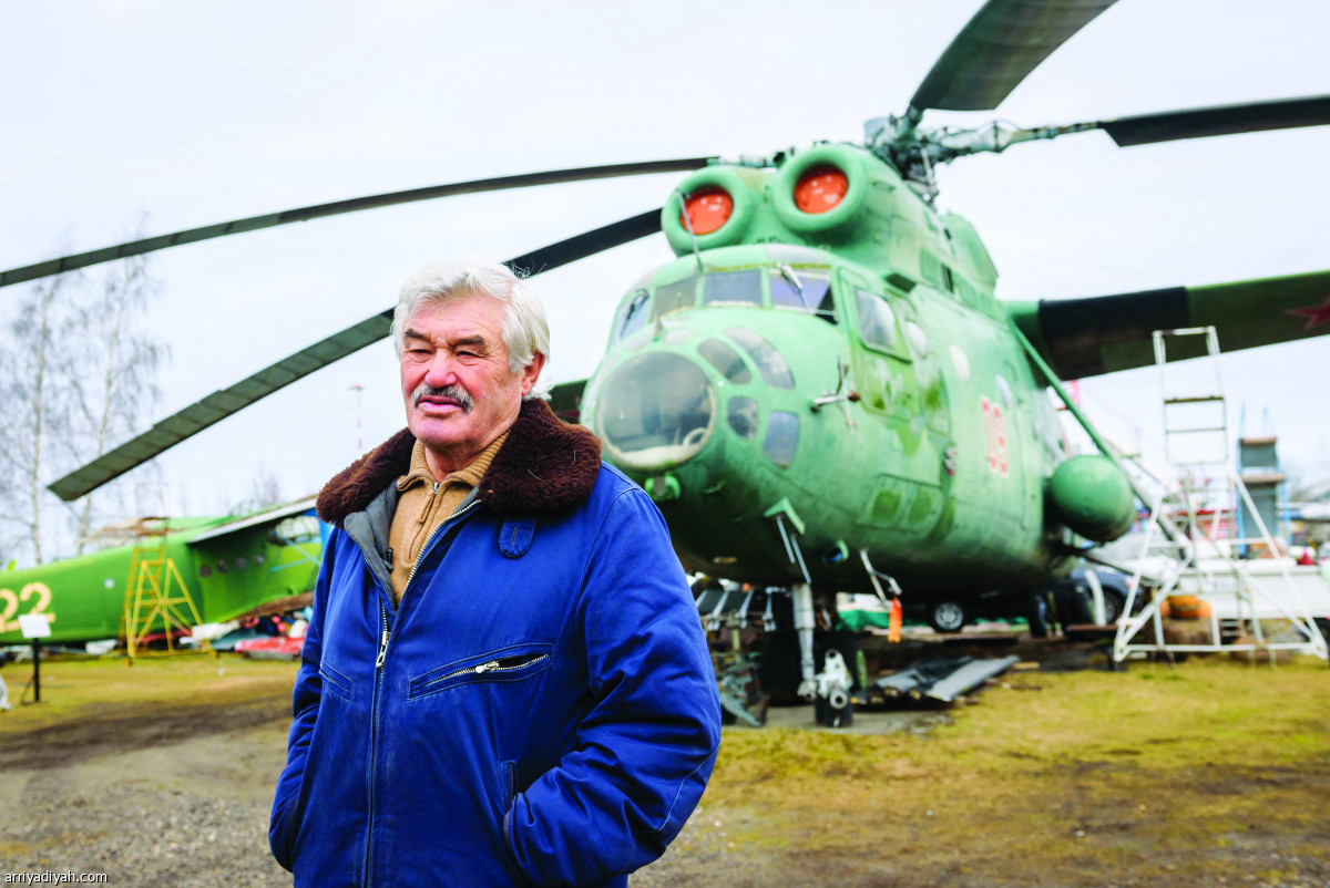 صورة التقطت لفيكتور تالباس صاحب المتحف يقف أمام المروحية القتالية مي 6 التي عرضها مع طائرات أخرى في أرض تابعة لمطار ريجا (الفرنسية)